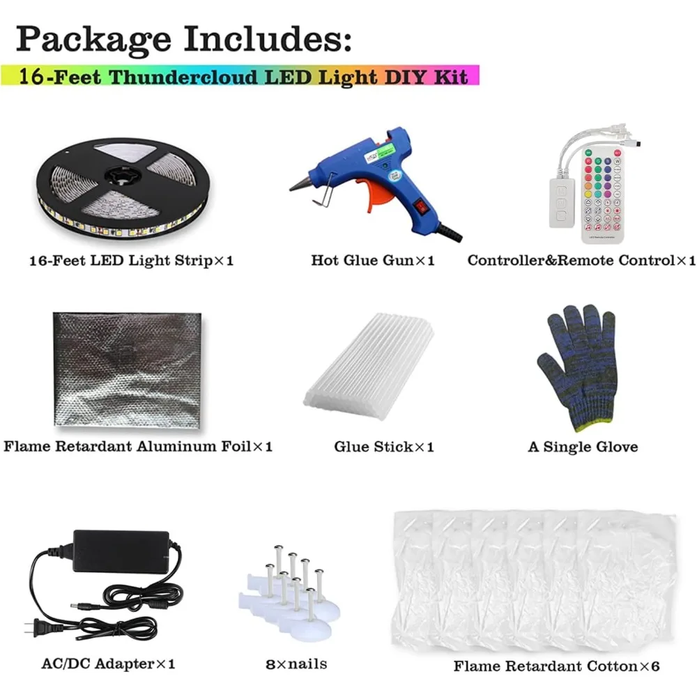 - Lightning Cloud : Four 16 Feet or two 32 Feet thundercloud sets can cover 72 square feet and fill a room with cloud lights. The lighting effects can flash in accordance with the thunderclouds, or you can create various atmospheres according to your own hobbies.