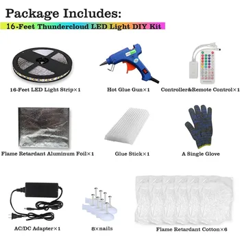 - DIY Created By You : 1*16 Feet LED Light Strip, 1*Hot Glue Gun, 1*Controller&, Remote Control, 1*Flame Retardant Aluminum Foil, 1*Glue Stick, 1* Single Glove, 1*AC/DC Adapter, 6* Flame Retardant Cloud. LED light strips self-adhesive tape can firmly adhere to any dry and smooth surface,solve the problem of falling light strips; We recommend you test the lights before installation.