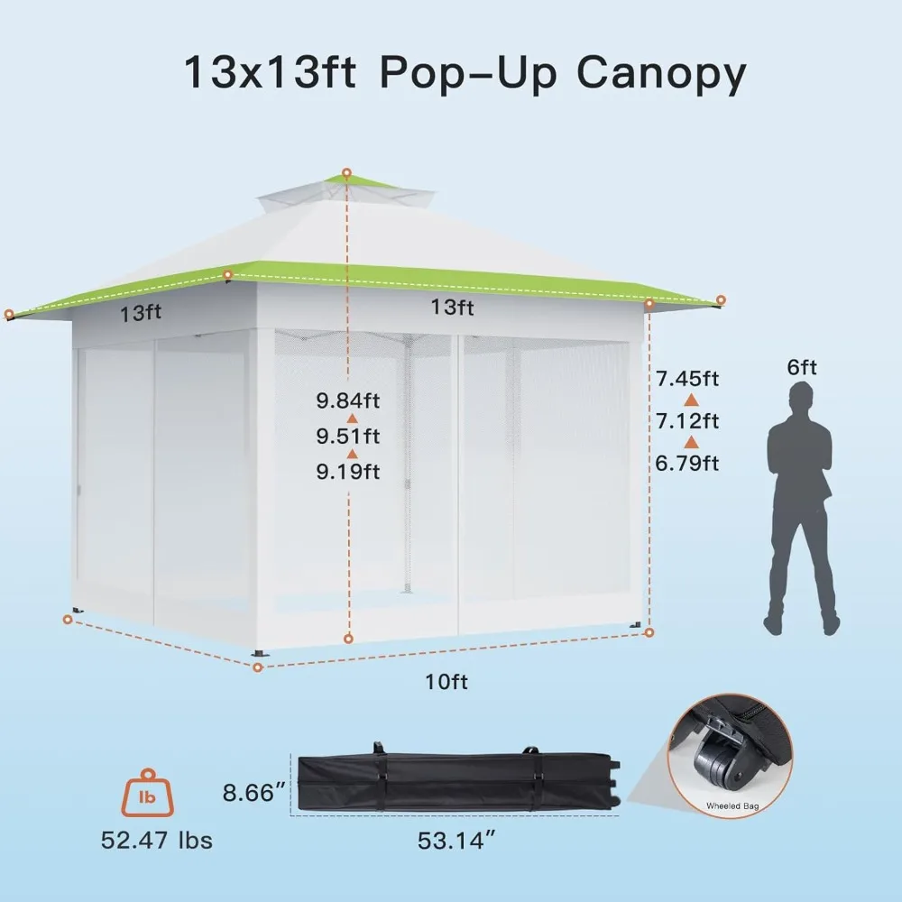 - 𝗦𝗽𝗮𝗰𝗶𝗼𝘂𝘀 &𝗜𝗱𝗲𝗮𝗹 𝗦𝗵𝗮𝗱𝗲 𝗦𝗼𝗹𝘂𝘁𝗶𝗼𝗻:With a 13×13 Pop Up Gazebo, pop up canopy footprint, this tent provides 169 square feet of shade, accommodating up to 10 people comfortably. The pop up canopy height can be adjusted in three levels according to needs: 8.46ft/8.80ft/9.12ft.TPerfect for outdoor fun like children’s parties, or birthdays on any surface from the parking lot outside the stadium to the grass at the park.