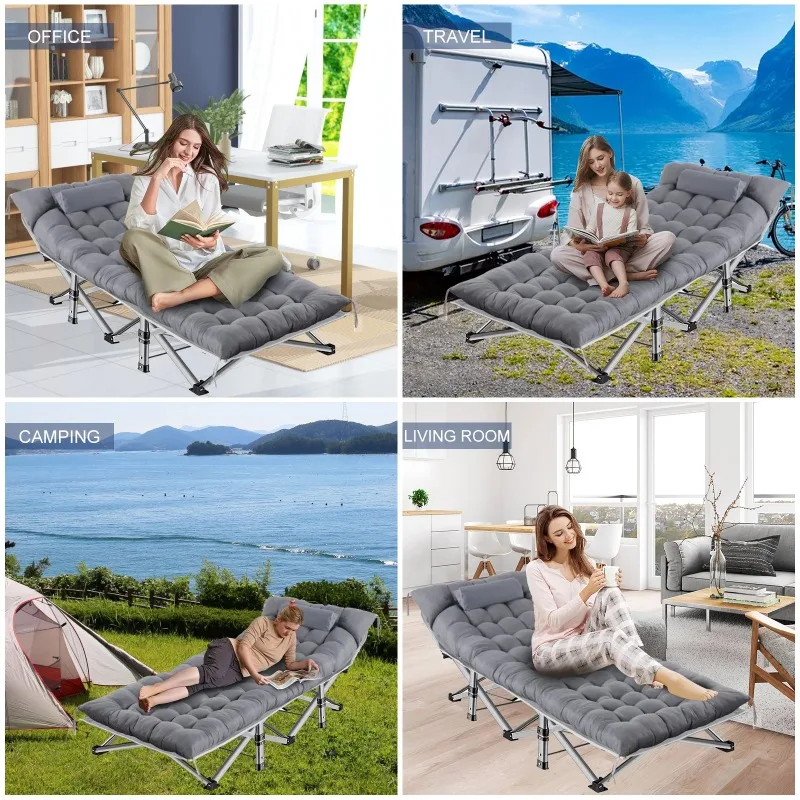 Our folding camping cot for adults will ensure you can relax on your camping trip with its user-friendly setup and portability. The comfortable cots for adults are designed to be extra wide and long to accommodate a range of camping enthusiasts. he camping tent cot bed provides an easy-to use portable sleep solution for camping trips, days at the beach, and lounging under the stars.
