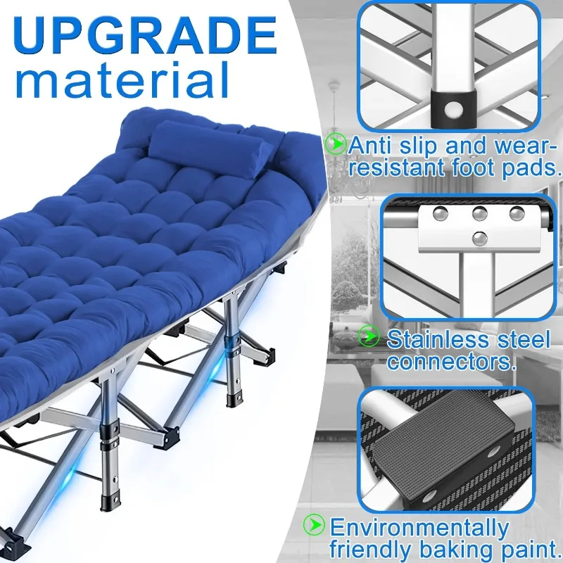 - 【Comfortable Mattress】Portable folding camping cot with mattress, soft pad add extra comfort, you can sleep more comfortably in this portable folding camping bed. In summer, the camping paded can also be take away to increase the breathability.