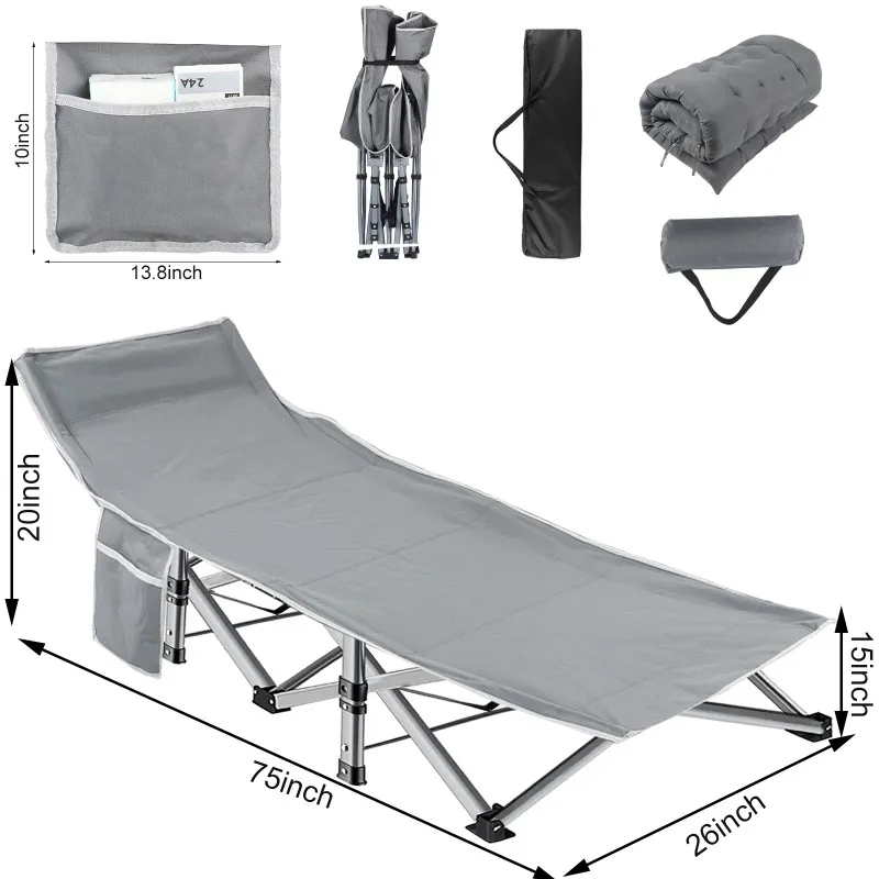 Our folding camping cot for adults will ensure you can relax on your camping trip with its user-friendly setup and portability. The comfortable cots for adults are designed to be extra wide and long to accommodate a range of camping enthusiasts. he camping tent cot bed provides an easy-to use portable sleep solution for camping trips, days at the beach, and lounging under the stars.