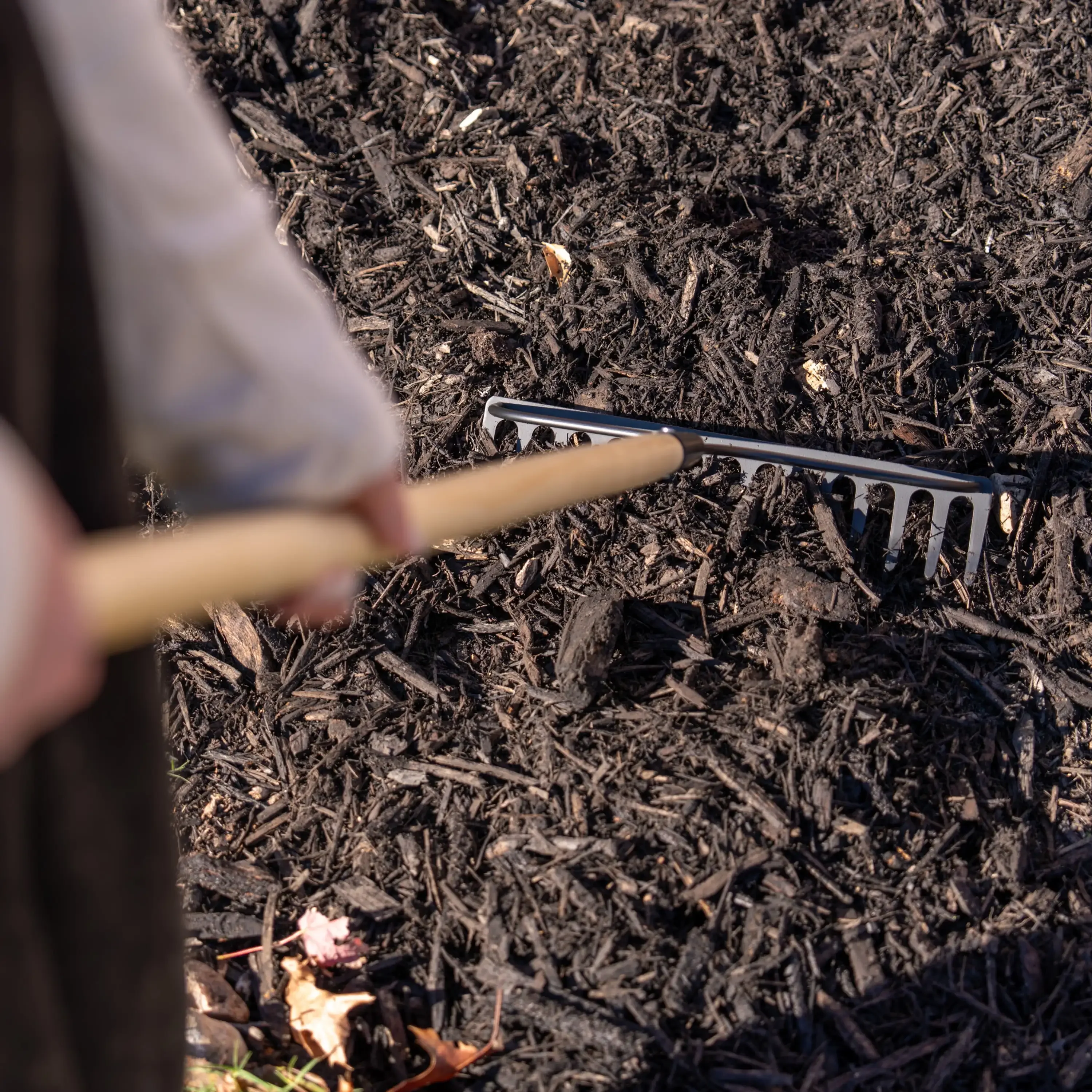 A garden bow rake is a durable and versatile gardening tool designed for efficient soil leveling, debris gathering, and soil aeration. Featuring a curved, bow-shaped head with evenly spaced, sturdy steel or aluminum tines, it is ideal for raking soil, leaves, grass clippings, and other yard debris. The flexible yet strong tines make it easy to work through soil without damaging plants or turf. The long wooden or fiberglass handle provides a comfortable grip and allows for extended reach, making it perfect for larger gardening tasks such as preparing garden beds, spreading mulch, or collecting leaves. Its design offers excellent control and balance, making it a must-have tool for any gardener.